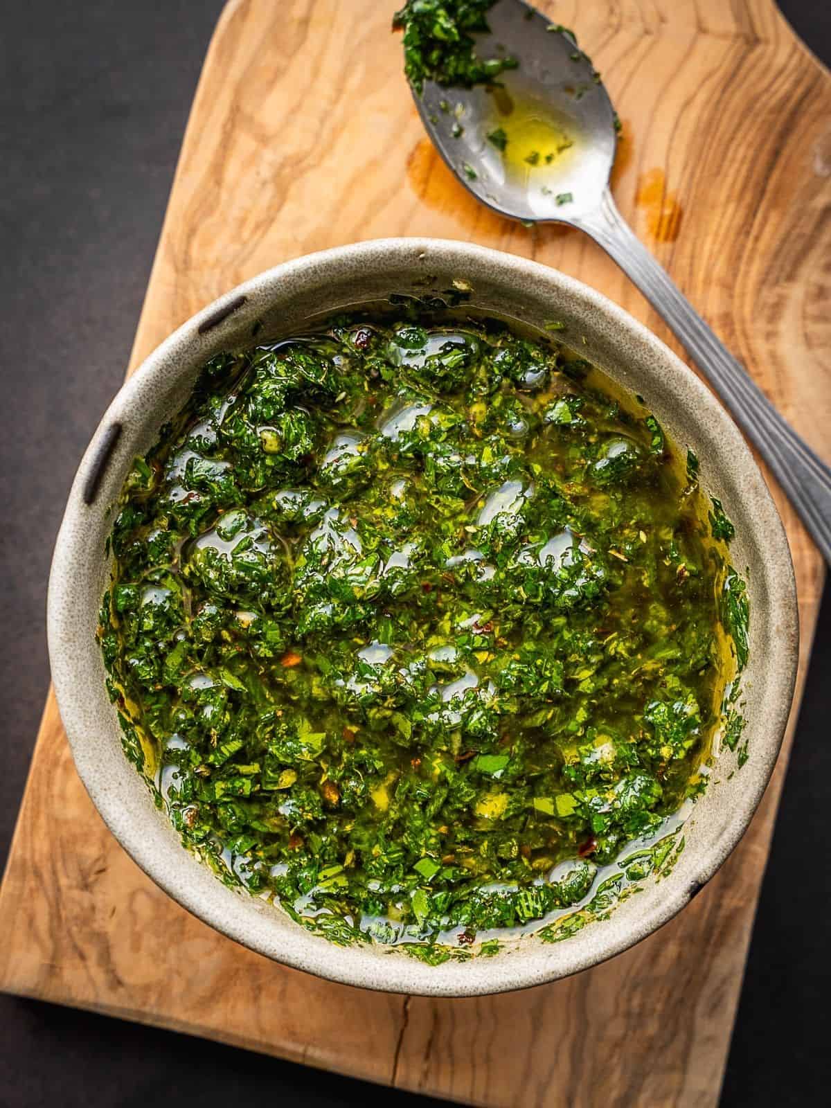 Chimichurri with mint is a variation of the traditional Argentinean chimichurri sauce, which typically includes parsley, garlic, vinegar, and oil. This version adds mint to the mix, giving the sauce a refreshing and slightly sweet flavor.